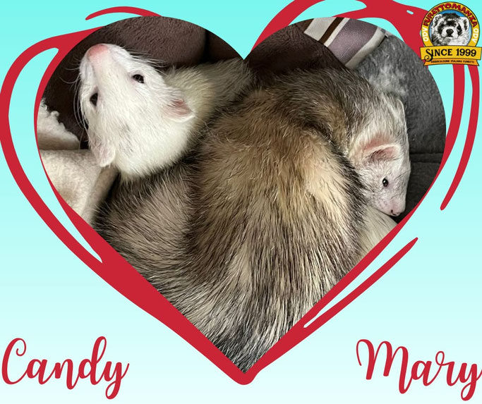 Nome: CANDY E MARY Sesso: F (IMPIANTATE) Età: 1 ANNO E MEZZO CIRCA Colore: ROANO Dove: LOMBARDIA Quando: OTTOBRE 2025 Candy è armonia, Mary è fantasia… per loro adesso serve la magia! Candy e Mary sono due furette giovani, poco più di un anno, unite da un legame profondo e dolcissimo, per cui inseparabili. Mangiano con gusto, sono brave con la lettiera, impiantate, stanno imparando a dosare i loro innocui morsi di entusiasmo, ma sanno anche regalare i momenti di coccole. Purtroppo però...